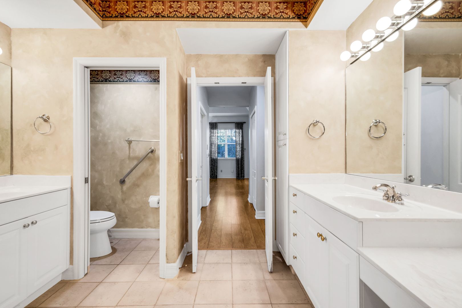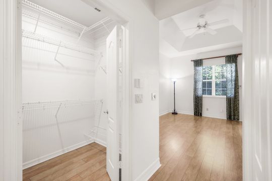 The first-floor primary suite offers wood-look flooring, walk-in closets, and a spa-like bath, while two guest bedrooms and an open loft provide flexible space for family or guests.