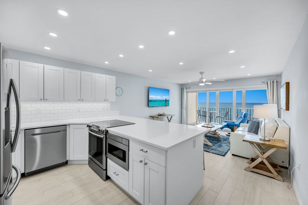 This beautifully RENOVATED 3rd floor BEACHFRONT condo-lives like a beach house. The redesigned, open concept, gourmet kitchen features high-end custom cabinets, under cabinet lighting, stunning white counters, stainless steel appliances including a spacious French door refrigerator, and under cabinet microwave. Professionally decorated, timeless upgrades including beautiful window treatments, white plantation shutters, newer AC, newer turtle impact glass sliding lanai doors, and a washer dryer combo. The soft and serene bedroom offers beautiful views of the blue gulf waters, two closets, and newer impact sliding glass doors. The stylish updated bathroom features custom cabinetry, a tiled walk-in shower, handheld shower head that features a range of spray settings, and frameless shower door. The position of C building is outstanding, and from the moment you enter this gorgeous beachfront residence unit C308 the views are captivating. Be one of the elite few who enjoy a beachfront lifestyle watching dolphins and sunsets in this exclusive Dolphin Way community.