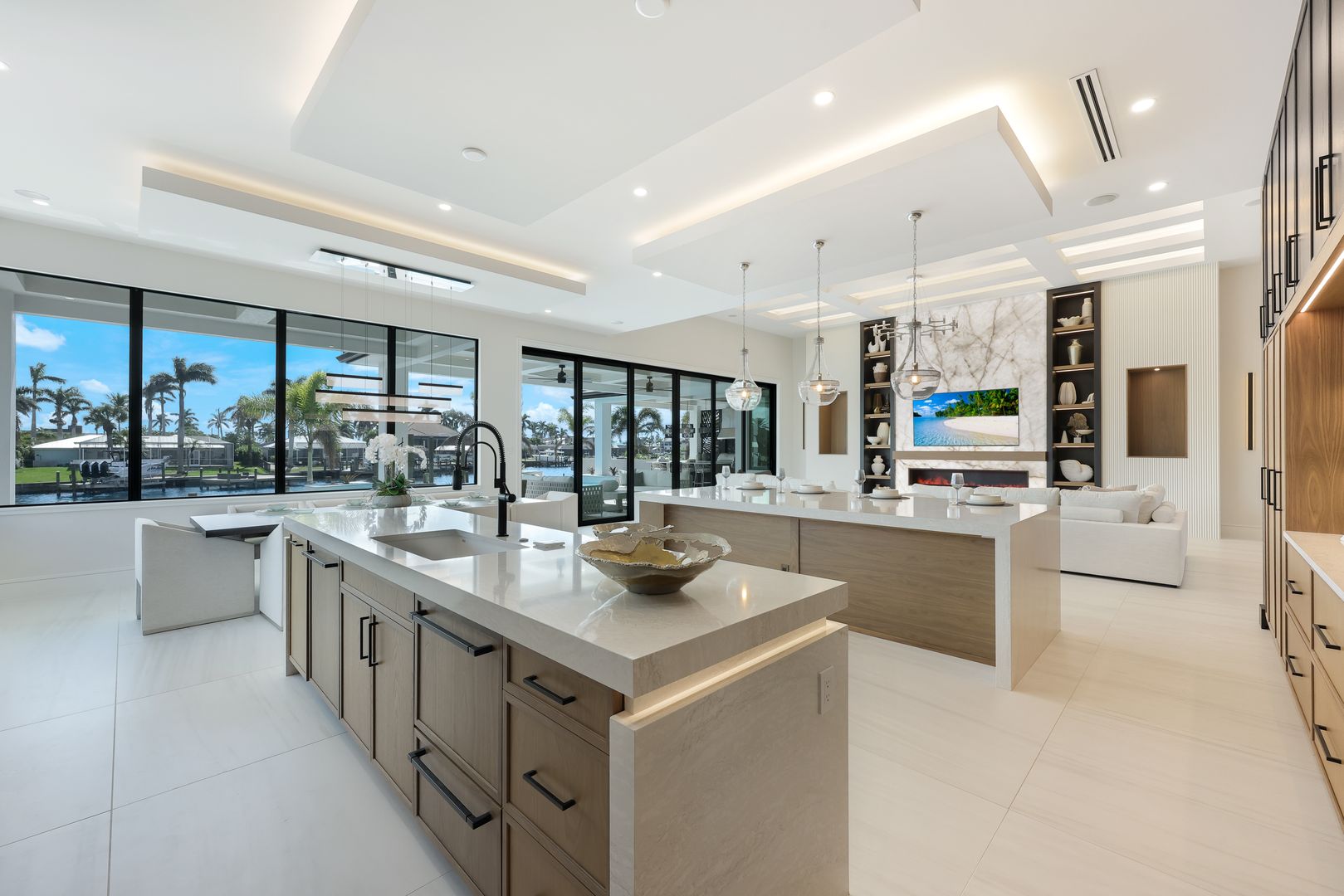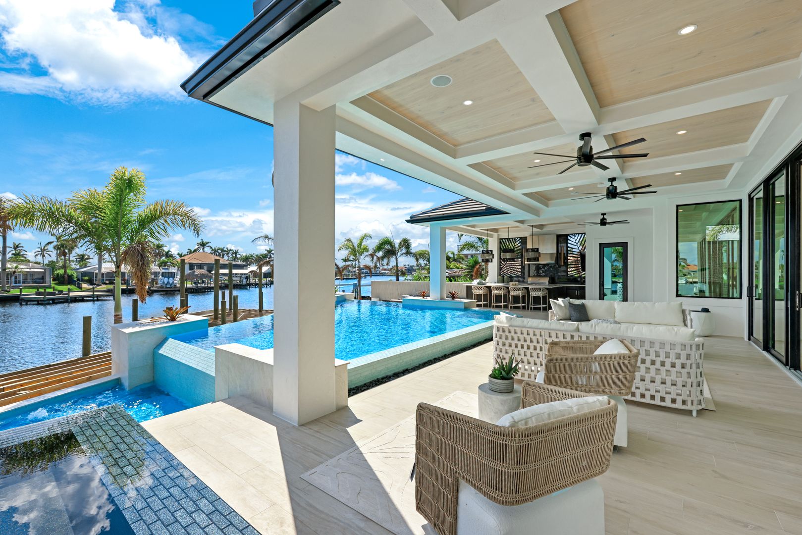 Introducing a remarkable newly constructed waterfront estate home, meticulously crafted by Lux Development Group to showcase one of Cape Coral's finest waterfront lots. This stunning property offers expansive southern views of intersecting canals and features rapid boating access, complemented by an impressive 238 feet of waterfront. The outdoor living area boasts a luxurious pool designed by FOXTERRA, a firm celebrated for creating beautiful pools for high-profile clients, including celebrities and athletes. Spanning 4,692 square feet, this single-story residence is fully furnished with curated pieces from top design brands, such as Bernhardt and Vanguard. It includes four en-suite bedrooms, an office, six bathrooms, and an air-conditioned garage. Perfect for hosting gatherings, the spacious open-concept living room showcases a stunning backlit Cristallo Stone accent wall, a captivating vapor fireplace and sweeping water views. The state-of-the-art kitchen is a culinary delight, featuring elegant black oak and walnut cabinetry, two waterfall islands, a Dacor gas range, a Thermador refrigerator/freezer combo, a wine cooler, and a hidden walk-in pantry. A wet bar and a glass-enclosed, temperature-controlled wine wall provide a sophisticated showcase for your wine collection. Additional highlights include a whole home generator and a Control 4 smart home system for seamless technology integration. The master suite offers stunning water vistas, while the master bathroom resembles a spa retreat, complete with double Moen U digital showers, a luxurious soaking tub, and a Toto smart toilet. Each guest bedroom is an individual suite, featuring a private bathroom, closet, and patio that overlooks the water. Laundry will be effortless with 2 washer and dryer units, along with an LG clothes steamer. The outdoor space is designed for leisure and entertainment, featuring an infinity edge pool, a relaxing spa, elegant pergolas, fire features, and a fully equipped outdoor kitchen, all with breathtaking views of the tranquil waterfront. The 238-foot dock provides ample docking space for yachts and multiple boats featuring two tiki huts. One of the largest docs in Cape Coral.