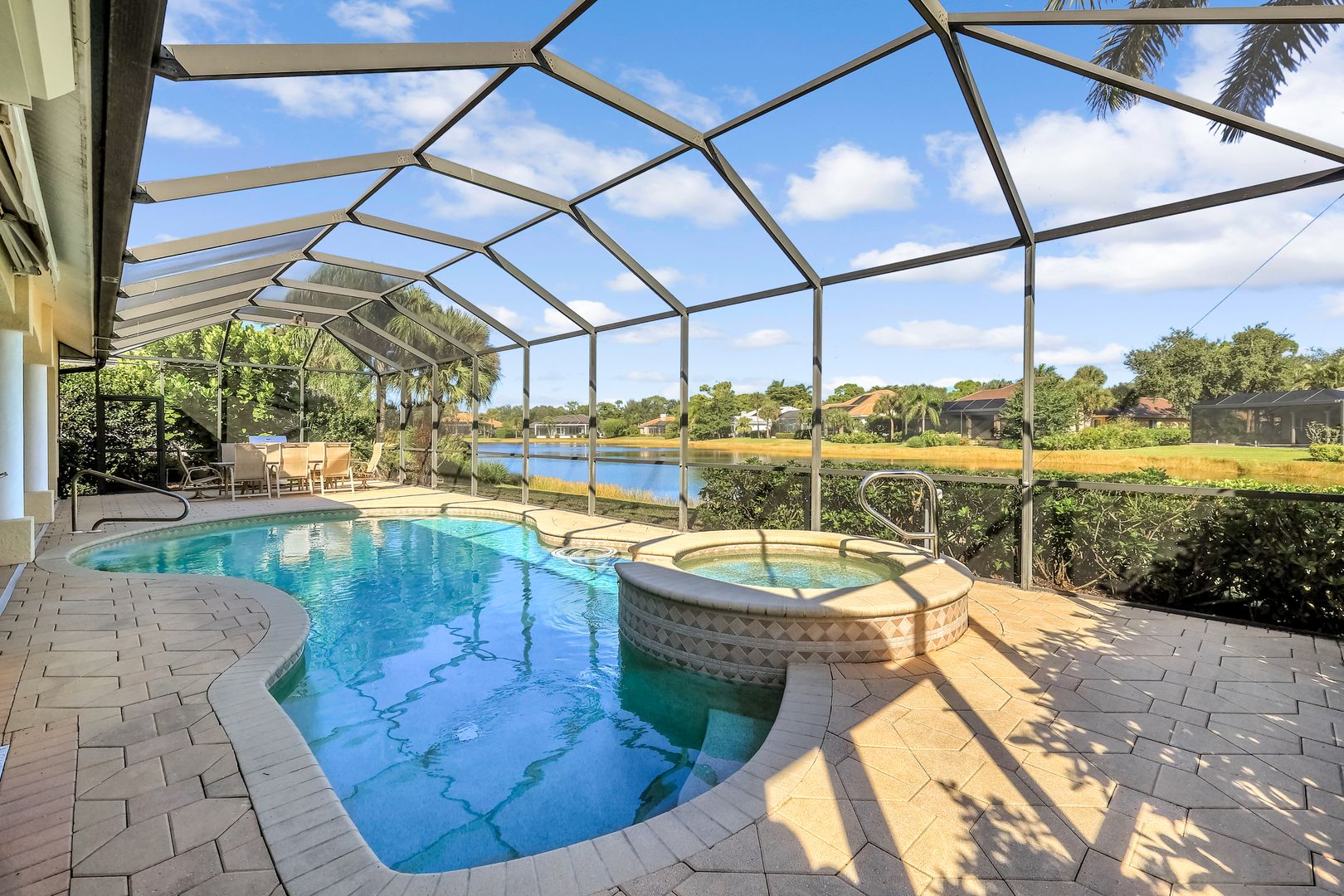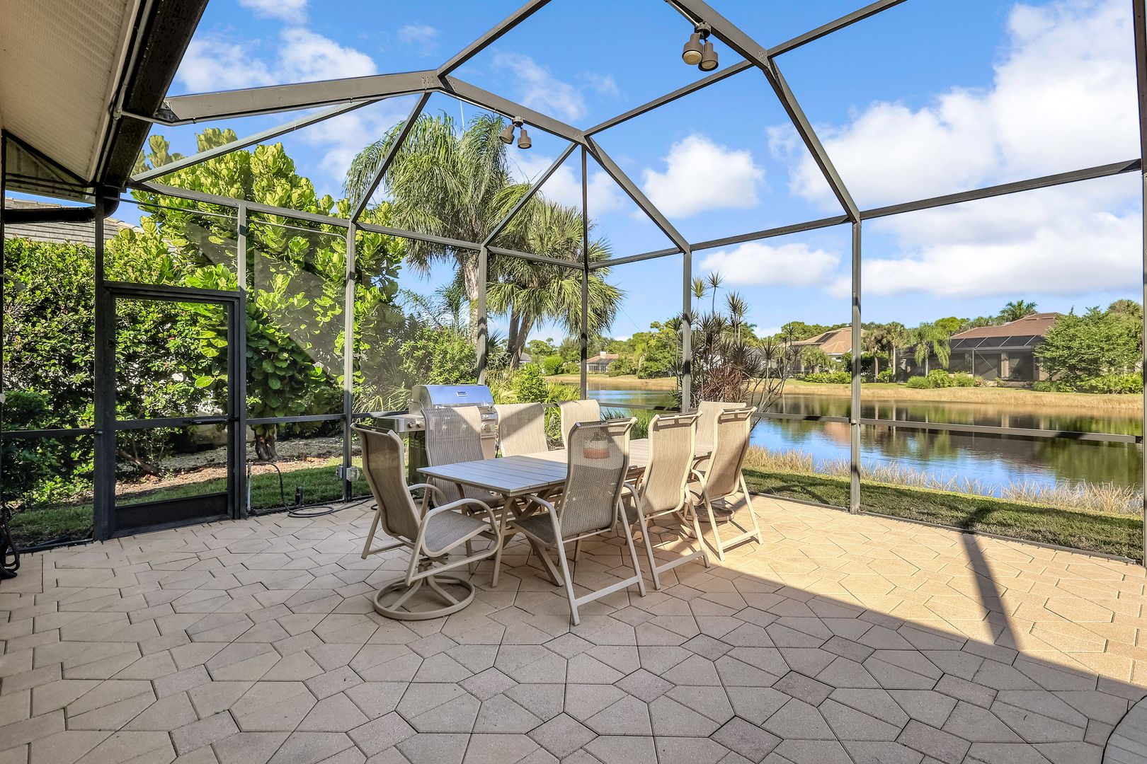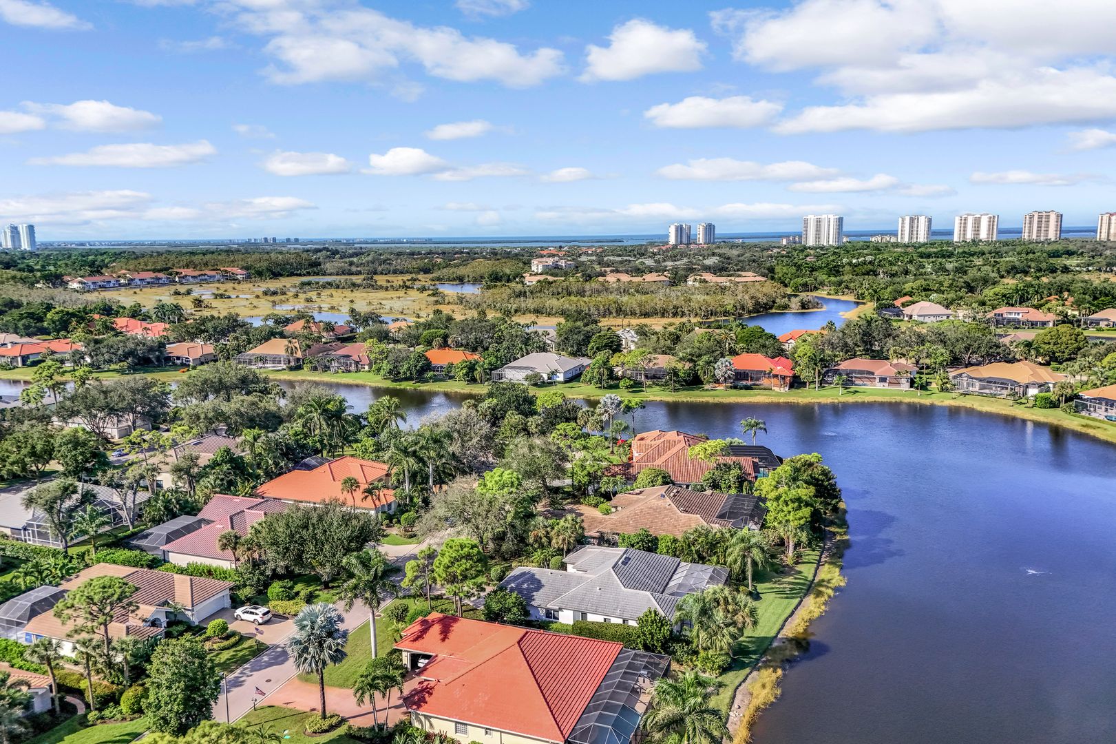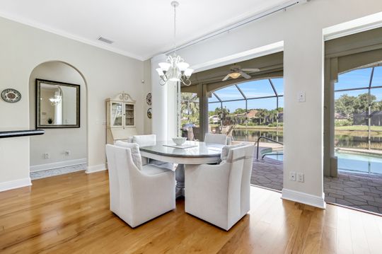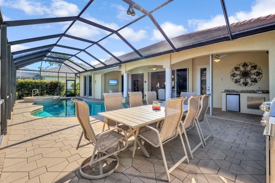 Sweeping lake and pool views define the experience at this refined Pelican Landing residence. With water vistas framed through wide sliding doors, the great room opens directly to a screened lanai with an outdoor kitchen. The pool area offers a spacious, private setting ideal for entertaining, all perfectly positioned to embrace the home’s lakefront setting. Designed for flexibility, the residence includes four bedrooms and three baths. One bedroom has been transformed into a custom-built office, featuring dual workstations and bay windows that welcome abundant natural light—ideal for working or learning from home. Engineered wood flooring extends throughout the home, creating a cohesive, low-maintenance foundation. Two guest baths have been fully remodeled with stylish finishes, including one with en-suite access, while the primary bath is thoughtfully designed for comfort and function. Located in a gated, amenity-rich community, residents enjoy access to a private beach park with complimentary boat shuttle, tennis and pickleball courts, a fully equipped fitness center, kayak and canoe launch, butterfly garden, sailing club and miles of nature trails. This home combines waterfront serenity with a premier Southwest Florida lifestyle.