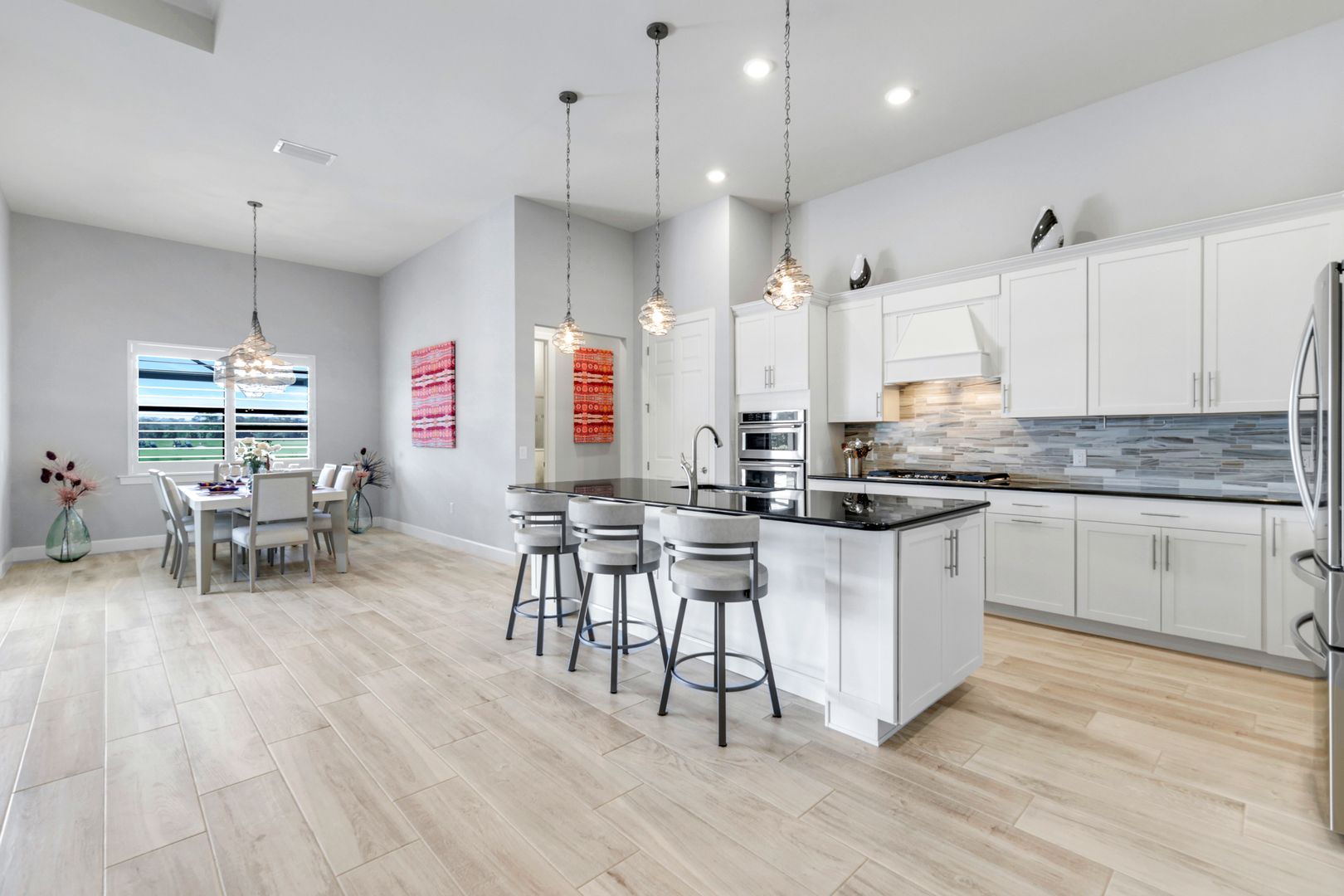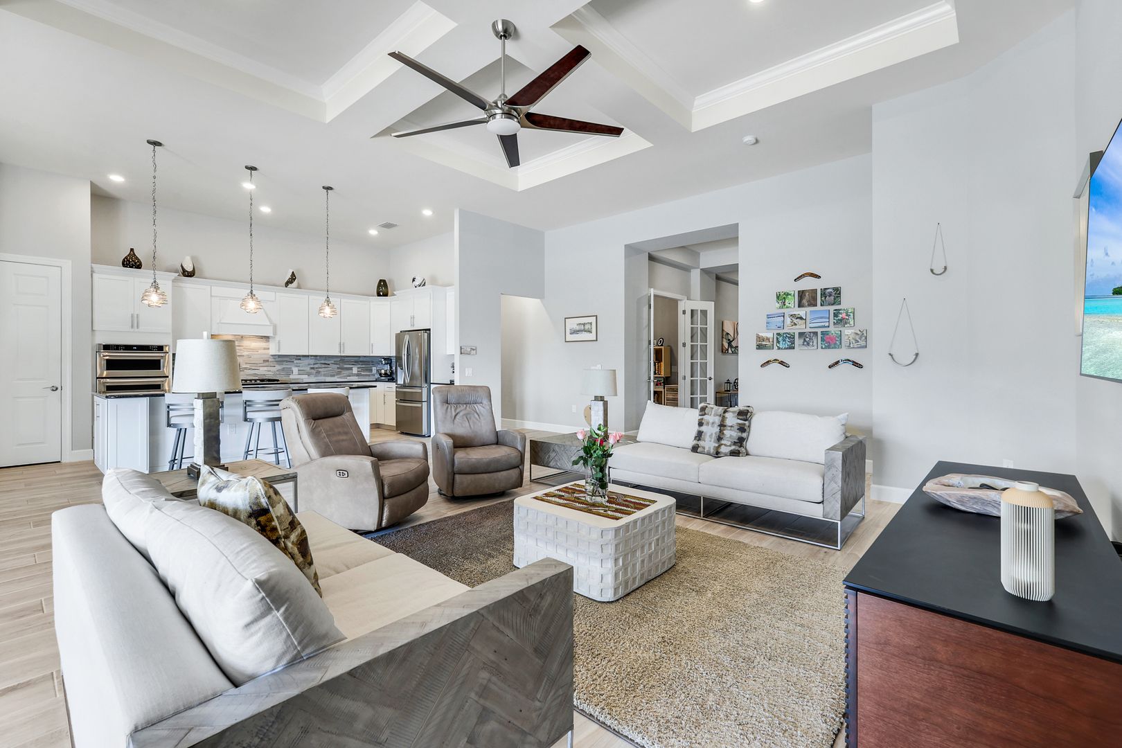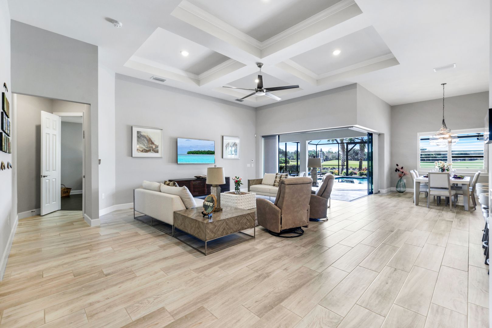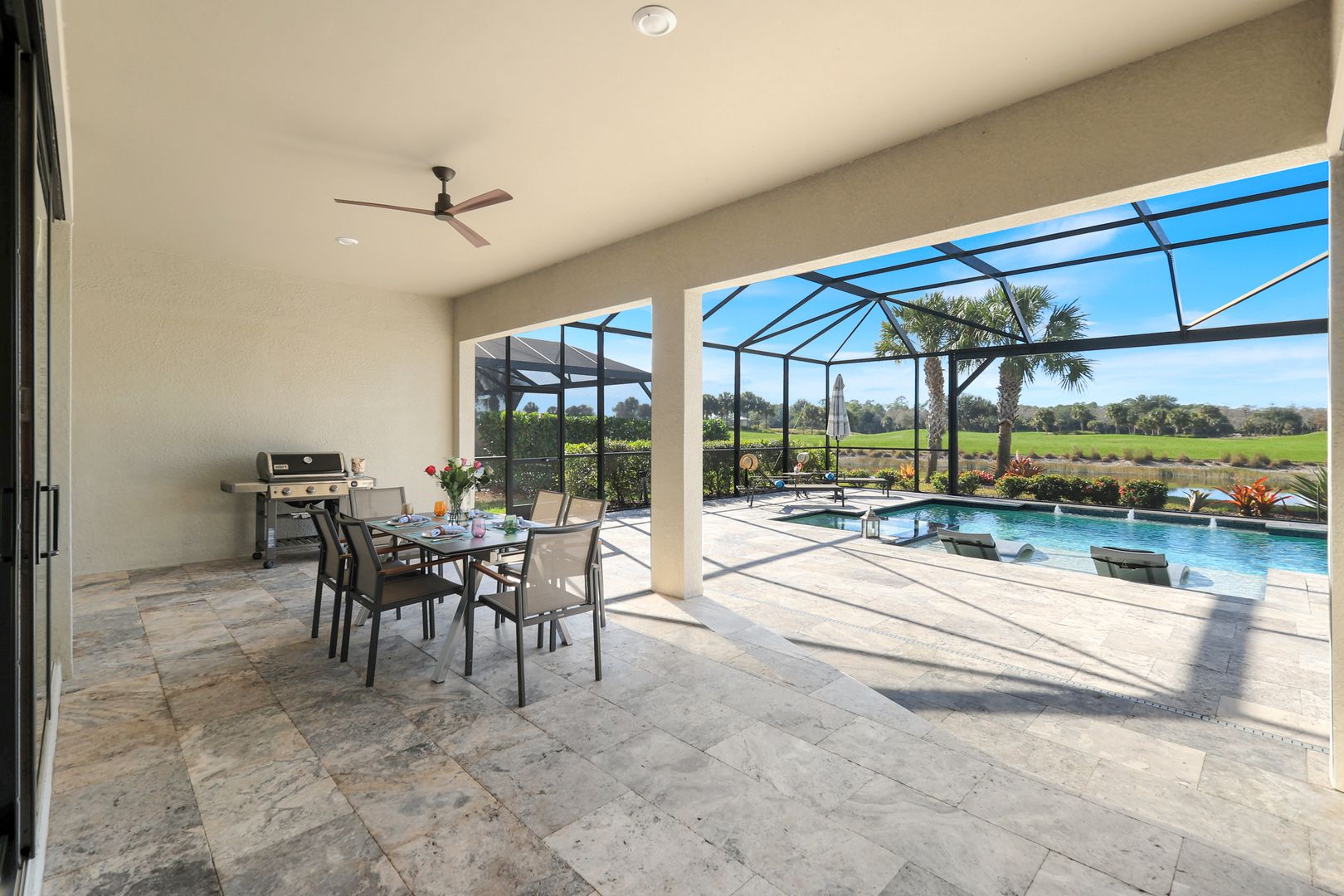 Calling all golf connoisseurs and luxury seekers. Welcome to an extraordinary, one-of-a-kind estate perfectly positioned on a premium cul-de-sac lot within the prestigious Greyhawk at Golf Club of the Everglades. This exceptional residence offers breathtaking, uninterrupted views of the tranquil lake and the 18-hole championship golf course, showcasing views of the 3rd, 11th, and 14th holes, along with the tee box for the 12th hole, all beautifully framed by a panoramic lanai—an ideal backdrop for unforgettable sunsets and serene mornings. This stunning Clubview model spans 3,083 square feet and is thoughtfully designed for both refined entertaining and everyday relaxation, creating the feel of a private resort. A charming rocking-chair front porch sets the tone, while the extended rear lanai invites you to fully embrace Florida’s indoor-outdoor lifestyle. Inside, a grand foyer opens to a spacious four-bedroom, three-bath layout complimented by two private offices/dens and anoversized three-car garage. The heart of the home is the chef’s kitchen, featuring gas cooking, an extended island, and seamless flow into the formal dining room and expansive gathering room, highlighted by an elegant coffered ceiling. The luxurious primary suite is a true retreat, offering dual custom oversized closets and a spa-inspired bath with soaking tub, walk-in shower, and ample linen storage. The guest wing provides exceptional privacy, featuring a large guest suite with custom walk-in closet and a Jack-and-Jill bedroom configuration sharing a third bath. Step outside to your private oasis: a covered and extended travertine lanai surrounds an oversized heated saltwater pool and spa, complete with sun shelf and fountains—perfect for entertaining or unwinding in style. The immaculate garage is equally impressive, featuring epoxy flooring, custom cabinetry, ceiling-height storage, and a split A/C system. Located in an amenity-rich, socially vibrant golf community, residents enjoy a full calendar of events, sports complex, state-of-the-art fitness center, resort-style heated pool, and two clubhouses with year- round dining. This is more than a home—it’s a lifestyle. Fall in love with this truly must-see luxury retreat.